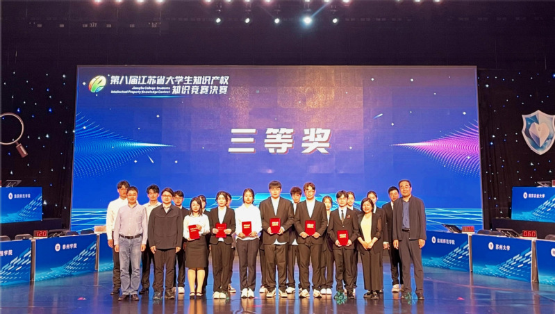 4月29日下午,由江苏省知识产权局、江苏省教育厅、共青团江苏省委主办的第八届江苏省知识产权知识竞赛决赛暨颁奖典礼在南京电视台演播厅举行,来自江苏省内的10所高校同台竞技,我校参赛学生团队获决赛三等奖,智能制造学院专职辅导员林磊获最佳指导老师奖,我校获最佳院校组织奖。