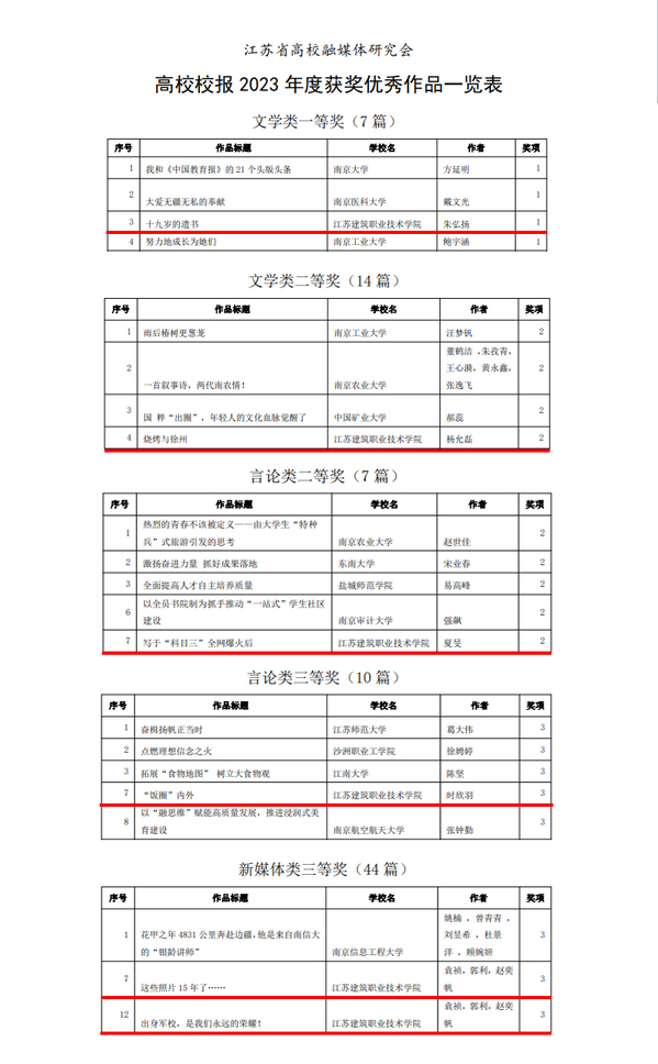 造价21-11班学生朱弘扬作品《十九岁的遗书》获文学类一等奖,党委宣传部教师杨允磊作品《烧烤与徐州》获文学类二等奖,机电22-6班学生夏旻作品《写于“科目三”全网爆火后》获言论类二等奖,环境22-1班学生时欣羽作品《“饭圈”内外》获言论类三等奖,党委宣传部教师袁祯、郭利以及房管22-1班学生赵奕帆共创的2件作品《这些照片15年了……》《出身军校,是我们永远的荣耀!》获新媒体类三等奖。