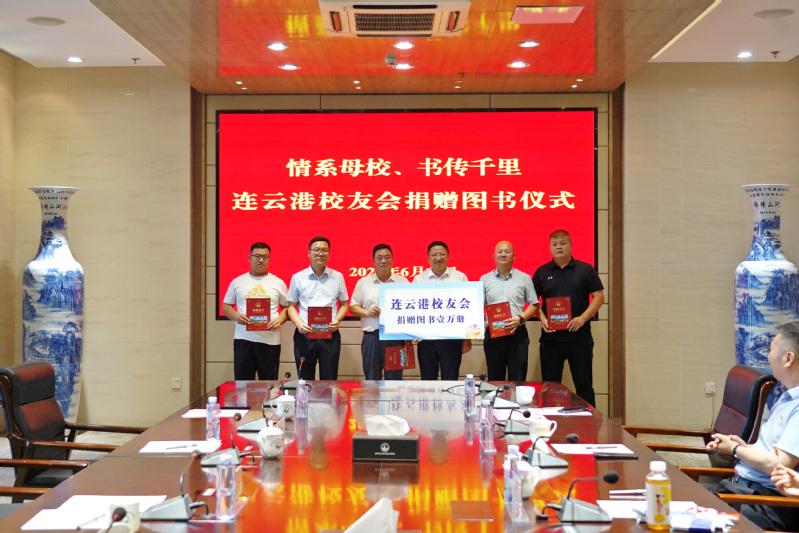 仪式上,梁惠、蒋兆峰代表学校接受捐赠并为校友会颁发捐赠牌匾和证书。连云港校友会会长万洪昌和杨来义、吴守洁、袁明、杨泗涛等连云港校友代表参加捐赠仪式,并亲自将一万册图书送至学校。