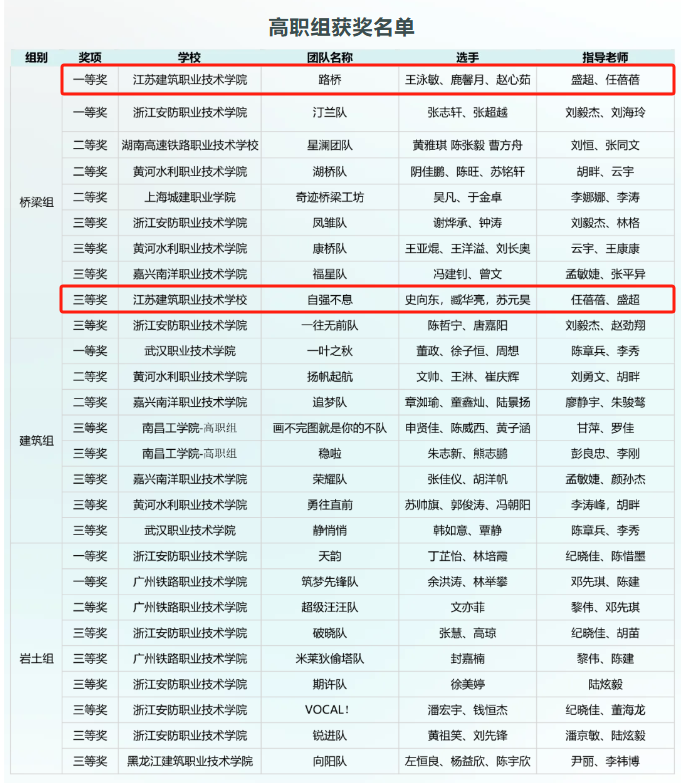 近日,在第四届全国高校土木工程创新设计大赛中,由我校交通工程学院教师盛超、任蓓蓓指导,路桥21级学生王泳敏、鹿馨月、赵心茹组成的参赛队伍获桥梁组一等奖第一名,路桥22级学生史向东、臧华亮、苏元昊组成的参赛队伍获桥梁组三等奖。