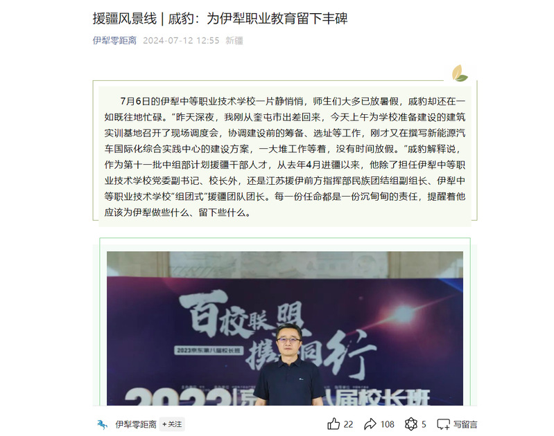 “伊犁职业教育大有可为,前景广阔。”一年多的援疆经历让戚豹深深认识到这一点,他带领援疆团队在职业教育领域大显身手,不仅让伊犁中等职业技术学校的各项工作走向前列,还为全州职业教育开拓出一片崭新天地。