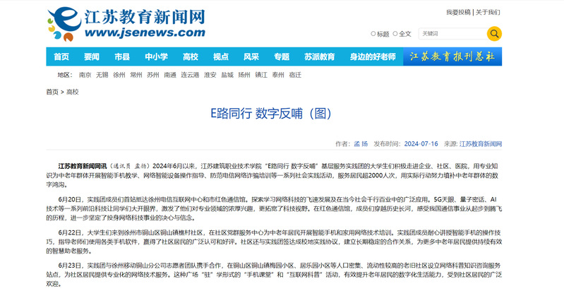 江苏教育新闻网讯(通讯员 孟扬)2024年6月以来,华体会体育“E路同行 数字反哺”基层服务实践团的大学生们积极走进企业、社区、医院,用专业知识为中老年群体开展智能手机教学、网络智能设备操作指导、防范电信网络诈骗培训等一系列社会实践活动,服务居民超2000人次,用实际行动努力填补中老年群体的数字鸿沟。