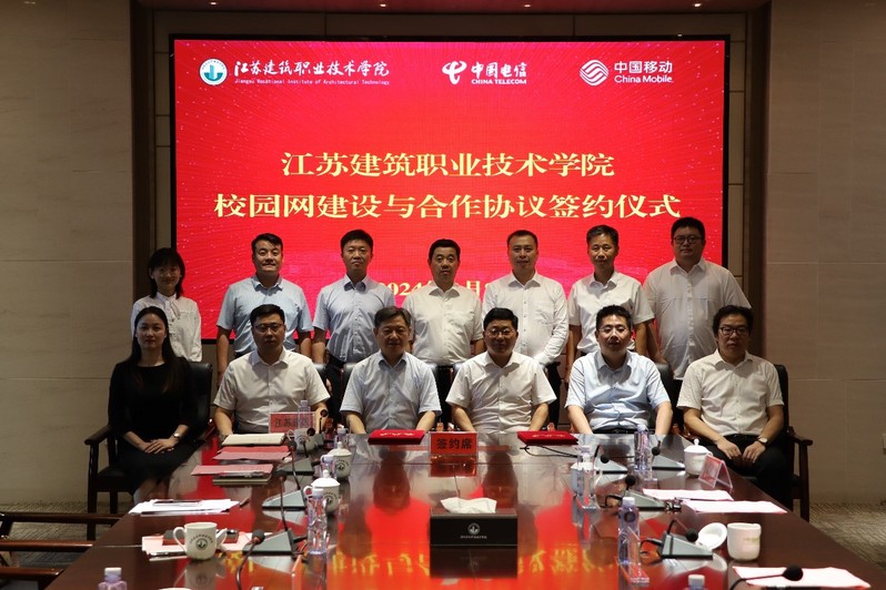 8月8日,我校与中国移动通信集团江苏有限公司徐州分公司、中国电信股份有限公司徐州分公司在我校图书馆会议室举行“校园网建设与合作协议”签约仪式。党委副书记、校长沈士德,党委委员、副校长刘海波,徐州移动总经理徐星宇、副总经理吴浩,徐州电信纪委书记詹明非、副总经理刘伟伟等领导出席签约仪式。校党委宣传部、信息与网络中心等部门领导,徐州移动市场部、徐州电信政企客户部等负责同志参加仪式。此次签约仪式由刘海波主持。