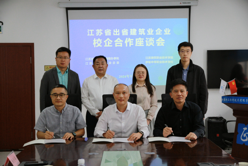 论坛结束后,朱东风一行及我校副校长,伊犁中等职业技术学校党委副书记、校长(援疆)戚豹参加了江苏省出省建筑业企业校企合作座谈会,会议由江苏省住建厅驻新疆办事处副主任俞颖初主持。会上,朱东风详细介绍了我校的发展历史、办学条件、取得成果及下一步发展规划,认真听取了与会企业代表的发言,了解企业发展情况和人才需求,并与伊犁中等职业技术学校、中建新疆安装工程有限公司签订三方校企合作协议。会后,朱东风一行还参观了中建新疆安装工程有限公司生产车间。
