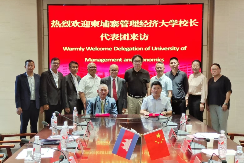 会上,沈士德代表学校对费克迪一行来访我校表示欢迎。他简要回顾了我校与柬埔寨管理经济大学长期合作所取得的成效,并介绍了我校在“职教出海”方面取得的成绩以及柬埔寨郑和学院建设的最新进展。刘海波则详细介绍了我校建设郑和学院的相关举措,以及我校在“中文+职业技能”人才培养方面的先进经验。