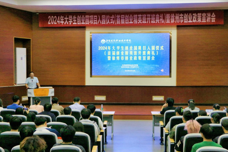 9月24日下午,我校2024年大学生创业园项目入园仪式(首届创业精英班开班典礼)暨徐州市创业政策宣讲会在创翼学堂举行。校党委委员、副校长蒋兆峰,徐州市创业工作指导中心主任殷飞、副主任王枫,各二级学院创业工作负责人,创业园项目团队及指导老师参加活动。