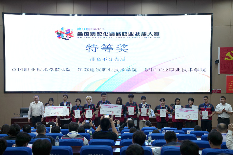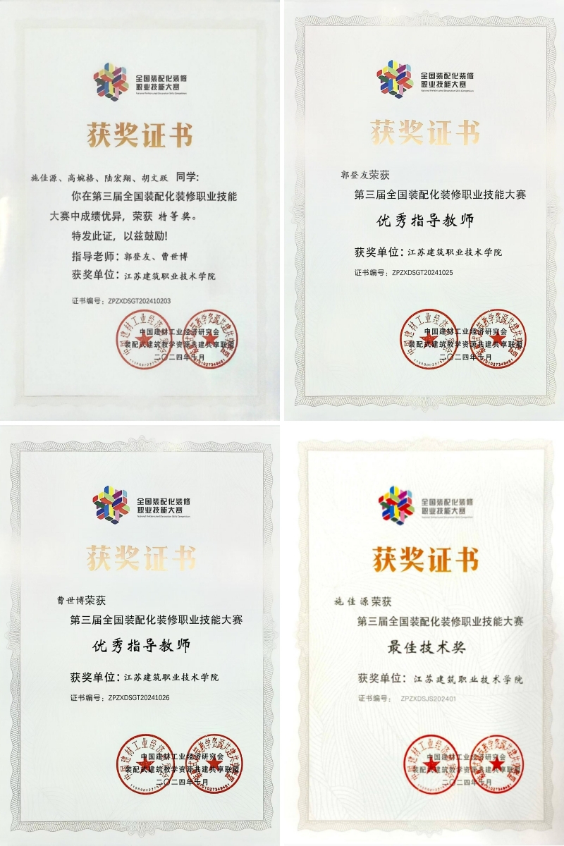 10月17日-18日,由中国建材工业经济研究会、全国装配化装修产教融合共同体主办,黄冈职业技术学院承办的全国第三届装配化装修职业技能大赛决赛暨装配化装修“新专业”建设论坛在湖北黄冈举行。由我校建筑装饰学院学生施佳源、高婉格、陆宏翔、胡文跃组成的参赛队伍获特等奖,同时施佳源获最佳技术奖,指导教师郭登友、曹世博获“优秀指导教师”称号。