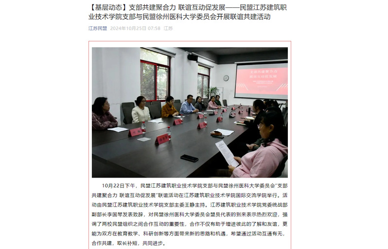 盟员们共同学习了中共二十届三中全会精神。民盟徐州医科大学委员会副主委胡书群介绍了委员会的基本情况,从成立背景到发展历程,从成员构成到在教学、科研等方面所取得的显著成绩。胡书群表示,此次联谊共建活动是一个宝贵的契机,希望能够与民盟华体会体育支部紧密合作,相互学习,共同探索教育教学改革的新路径,为培养更多优秀的人才贡献民盟的力量。