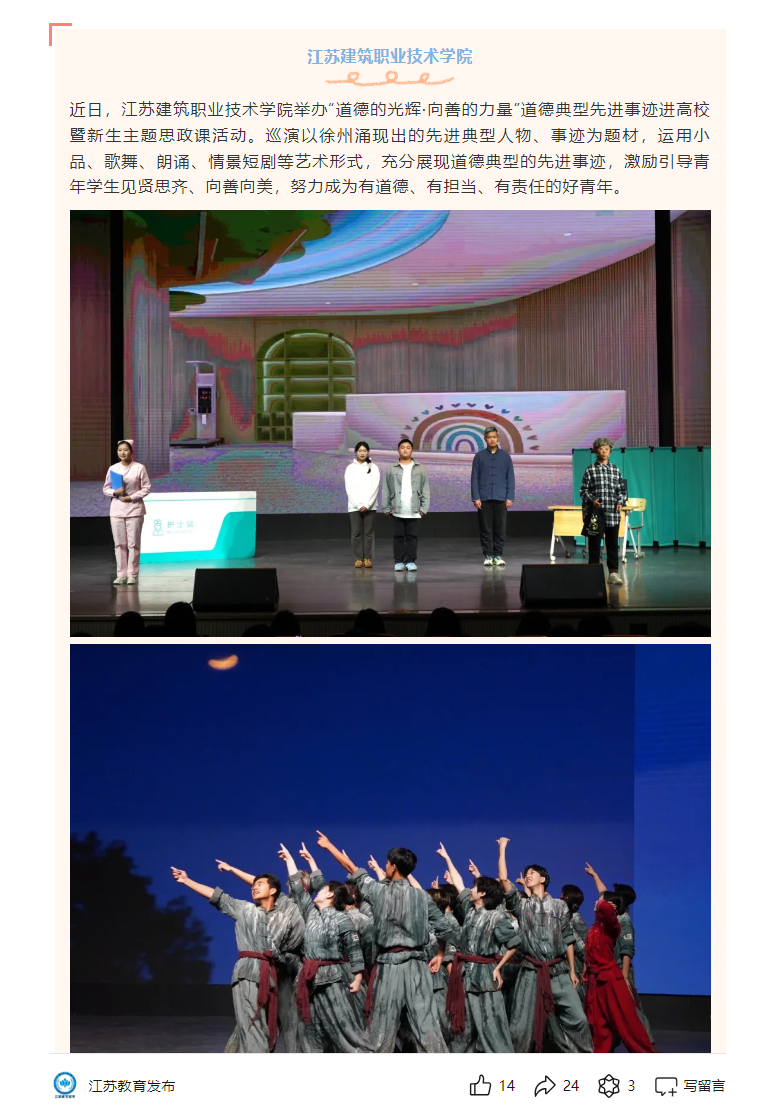 近日,华体会体育举办“道德的光辉·向善的力量”道德典型先进事迹进高校暨新生主题思政课活动。巡演以徐州涌现出的先进典型人物、事迹为题材,运用小品、歌舞、朗诵、情景短剧等艺术形式,充分展现道德典型的先进事迹,激励引导青年学生见贤思齐、向善向美,努力成为有道德、有担当、有责任的好青年。
