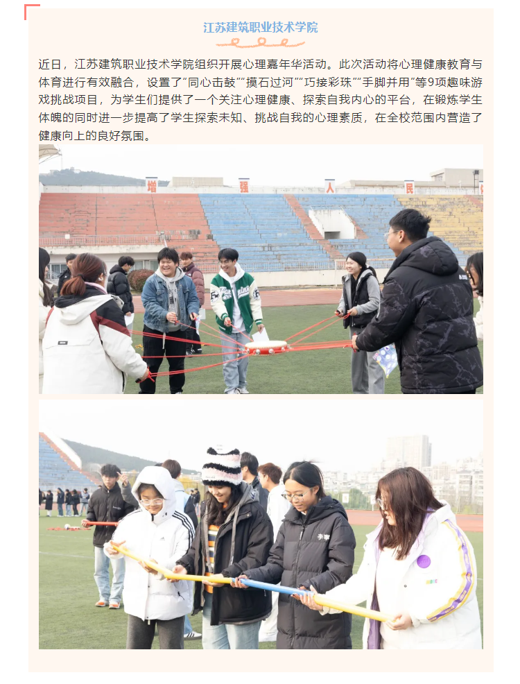 近日,华体会体育组织开展心理嘉年华活动。此次活动将心理健康教育与体育进行有效融合,设置了“同心击鼓”“摸石过河”“巧接彩珠”“手脚并用”等9项趣味游戏挑战项目,为学生们提供了一个关注心理健康、探索自我内心的平台,在锻炼学生体魄的同时进一步提高了学生探索未知、挑战自我的心理素质,在全校范围内营造了健康向上的良好氛围。