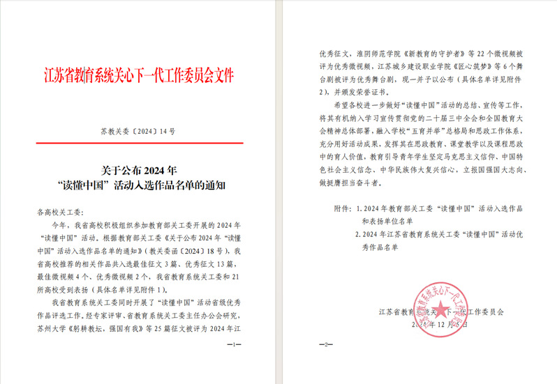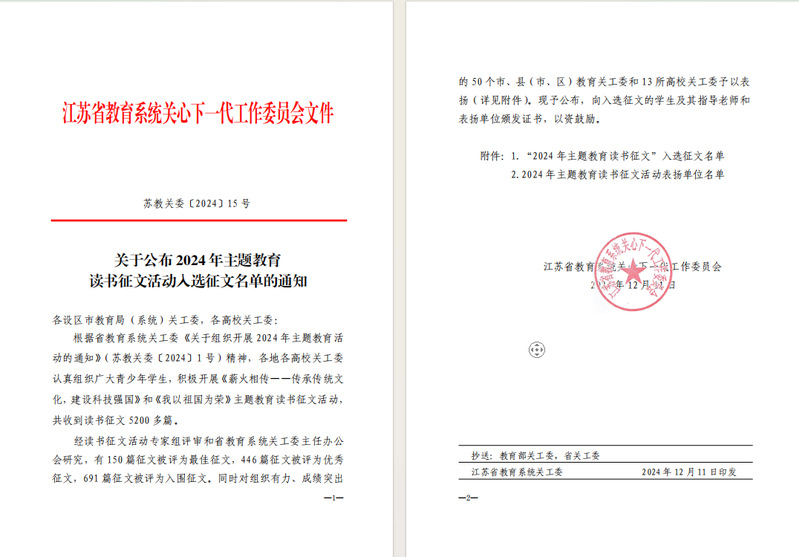 近日,我校关工委选送的文章《以测绘精神锤炼中国“精度”》(作者:贾岷璋,指导老师:蒋欣)、《盛世荣光,心向祖国》(作者:王佳宇,指导老师:苗利丽)、《激荡中华科技之魂》(作者:杨克农,指导老师:郭崇嵩)、《以科技之刀,辟未来之路》(作者:程欣悦,指导老师:刘淄怡)获江苏省教育系统关心下一代工作委员会“2024年主题教育读书及征文活动”优秀征文奖;文章《耄耋之年献余热 初心弥坚立杏坛》(作者:李晓露,指导老师:郝小新)获2024年“读懂中国”活动优秀征文奖;微视频《人民的胜利》(作者:胡艺露,指导老师:郭崇嵩、白金一、虞莉)获2024年“读懂中国”活动优秀微视频奖。