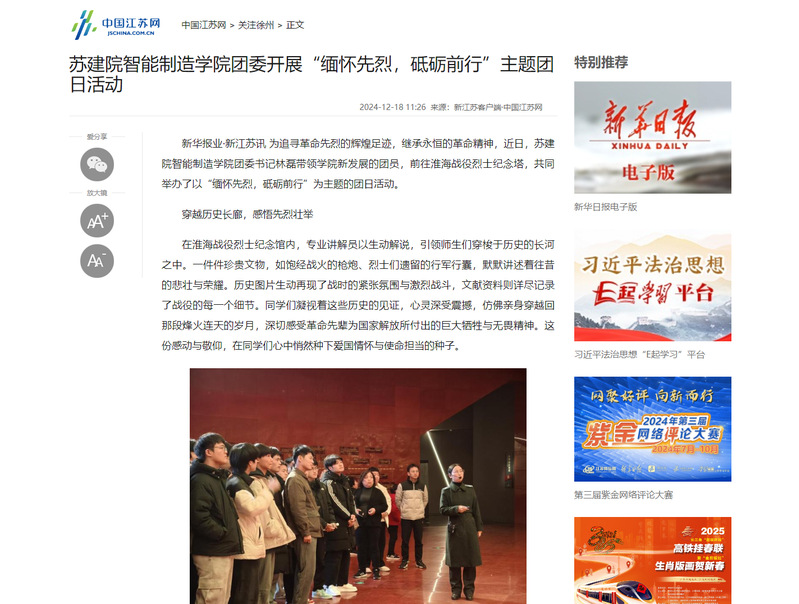 新华报业·新江苏讯 为追寻革命先烈的辉煌足迹,继承永恒的革命精神,近日,苏建院智能制造学院团委书记林磊带领学院新发展的团员,前往淮海战役烈士纪念塔,共同举办了以“缅怀先烈,砥砺前行”为主题的团日活动。