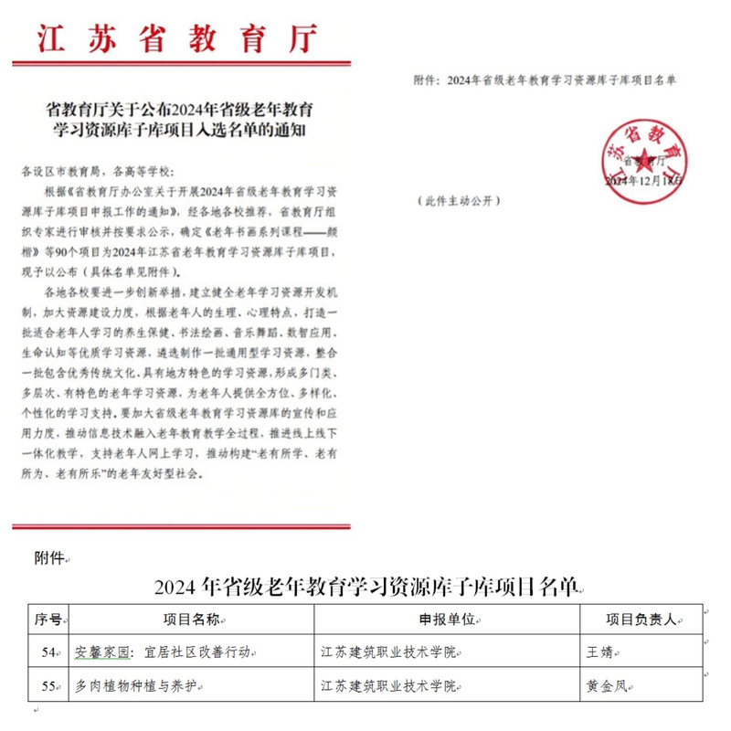 近日,江苏省教育厅公布了2024年省级老年教育学习资源库子库项目认定结果,此次评选共有64家单位的90门课程入选,其中包括我校建筑管理学院教师王婧主持的课程《安馨家园:宜居社区改善行动》和建筑装饰学院教师黄金凤主持的课程《多肉植物种植与养护》。