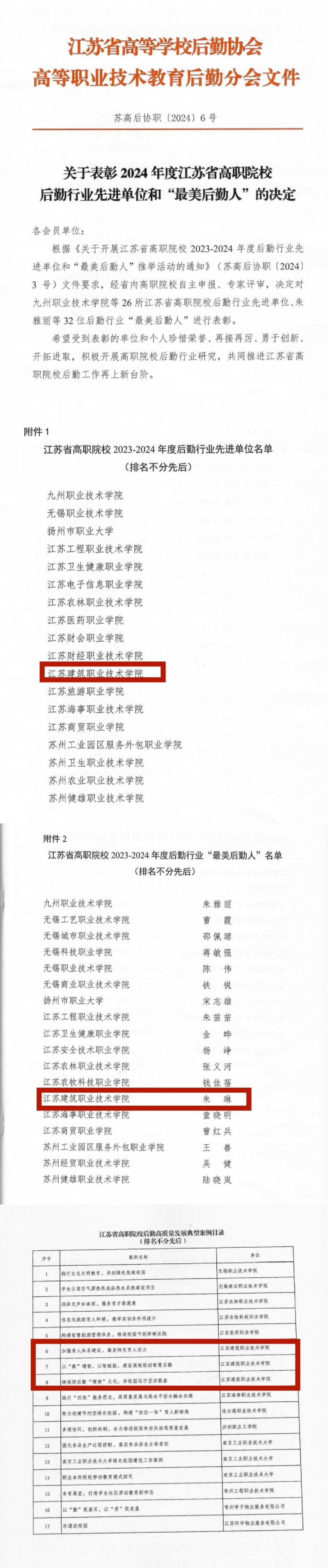 12月25日,江苏省高校后勤协会高职后勤分会第二届第三次会员大会暨后勤论坛在扬州召开。会上,我校获“江苏省高职院校2023-2024年度后勤行业先进单位”称号,校医院职工朱琳被授予江苏省高职院校2023-2024年度后勤行业“最美后勤人”荣誉。同时,我校选送的三个案例《以“数”增智,以智赋能,建设高校联动智慧后勤》《加强育人体系建设,激发特色育人活力》《铸高职后勤“硬核”文化,夯校园运行坚实根基》入选江苏省高职院校后勤高质量发展典型案例目录。