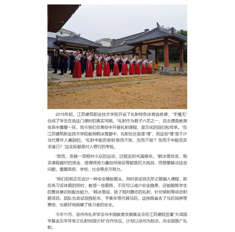 今年11月,徐州市礼学学会与中国教育发展基金会在江苏建院签署“大成国学基金五学并举之礼射校园计划”合作协议,计划以徐州为起点,向全国推广礼射。