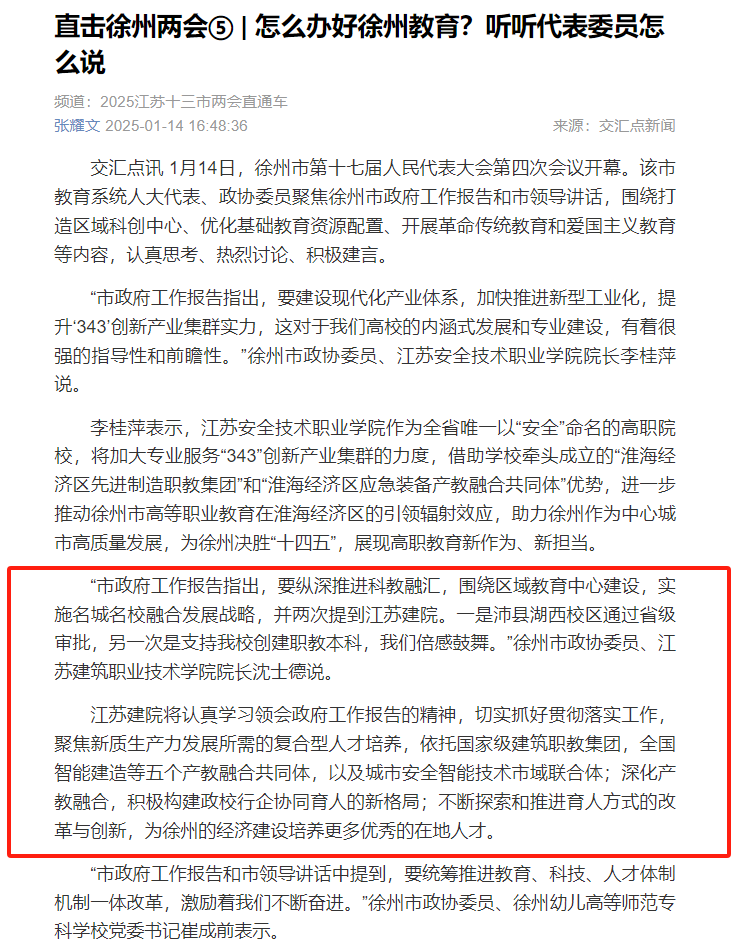 江苏建院将认真学习领会政府工作报告的精神,切实抓好贯彻落实工作,聚焦新质生产力发展所需的复合型人才培养,依托国家级建筑职教集团,全国智能建造等五个产教融合共同体,以及城市安全智能技术市域联合体;深化产教融合,积极构建政校行企协同育人的新格局;不断探索和推进育人方式的改革与创新,为徐州的经济建设培养更多优秀的在地人才。
