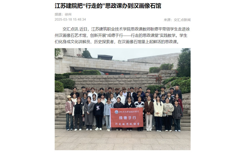 江苏建院马克思主义学院院长邓鹏认为,“行走的思政课”打破传统课堂时空限制,将徐州汉文化资源转化为育人优势,成为“大思政课”建设的创新实践。学生在文化现场感知民族精神,在实践中内化价值理念,真正让思政教育活起来、实起来。(张文远)