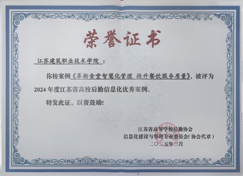 近日,江苏省第六届高校后勤互联网大会暨信息化建设与管理专业委员会2024年会在江苏科技大学召开,我校报送的案例《革新食堂智慧化管理,提升餐饮服务质量》被评为2024年度江苏省高校后勤信息化优秀案例。