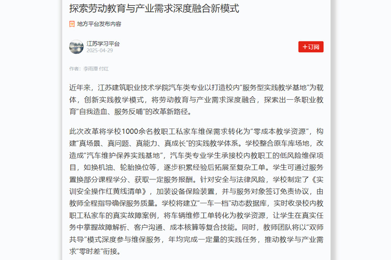 劳动教育是此次改革的重要内核。学院将“精益求精”的工匠精神具象化为可量化标准,例如在钣金修复中植入“0.1毫米精度控制”训练,在ADAS标定中强化“三次校验、双人复核”的职业习惯。重构“师生即师徒”机制,学生将在教师指导下完成“带徒维修—独立接单—联合质检”的三阶成长,让校园车间成为工匠精神的实践课堂。另外,学院将与本地4S店共建“故障案例资源库”,教职工车辆的维保数据将反哺企业技术改进,形成“学校省经费、企业获数据、学生强技能”的良性生态,助力区域汽车产业服务标准化。