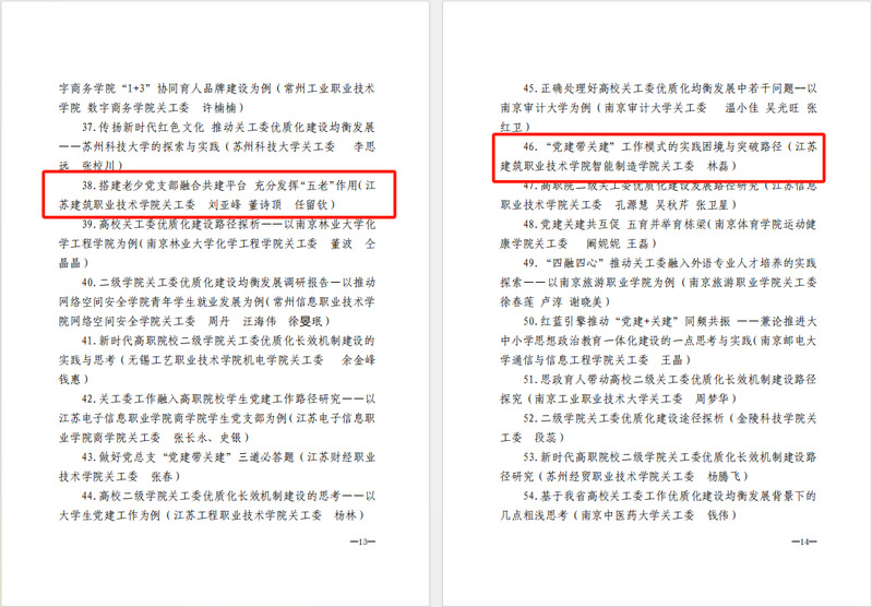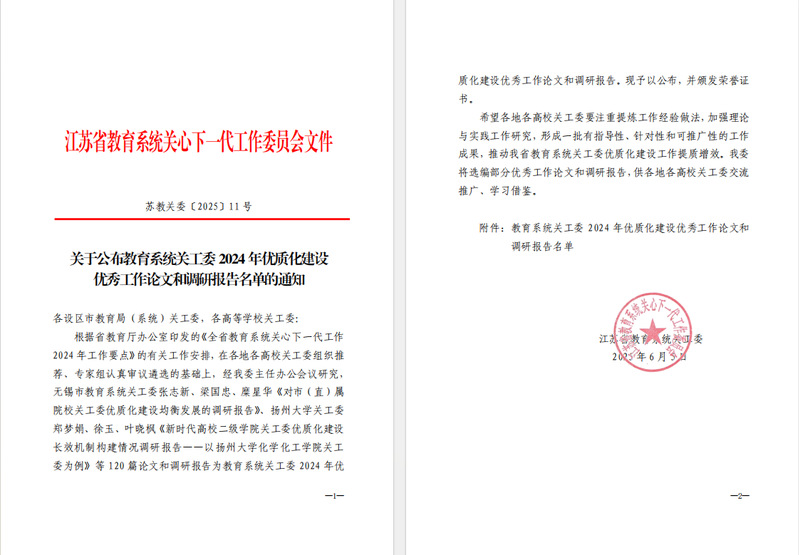 近日,江苏省教育系统关工委公布了2024年优质化建设优秀工作论文和调研报告评选结果,我校关工委报送的《搭建老少党支部融合共建平台,充分发挥“五老”作用》(作者:刘亚峰、董诗顶、任留钦)、《“党建带关建”工作模式的实践困境与突破路径》(作者:林磊)两篇作品荣获殊荣。