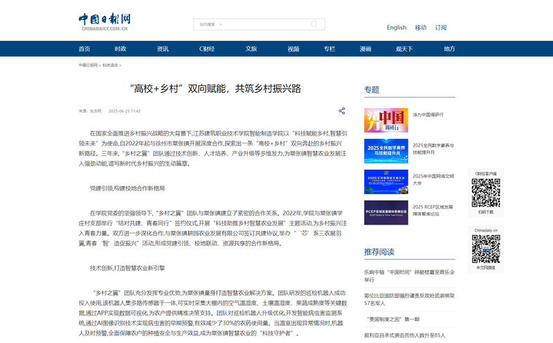 在国家全面推进乡村振兴战略的大背景下,华体会体育智能制造学院以“科技赋能乡村,智慧引领未来”为使命,自2022年起与徐州市棠张镇开展深度合作,探索出一条“高校+乡村”双向奔赴的乡村振兴新路径。三年来,“乡村之翼”团队通过技术创新、人才培养、产业升级等多维发力,为棠张镇智慧农业发展注入强劲动能,谱写新时代乡村振兴的生动篇章。