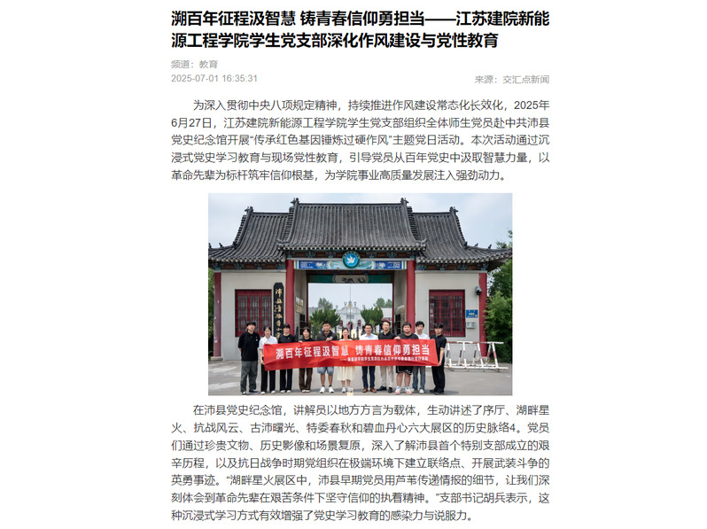 为深入贯彻中央八项规定精神,持续推进作风建设常态化长效化,2025年6月27日,江苏建院新能源工程学院学生党支部组织全体师生党员赴中共沛县党史纪念馆开展“传承红色基因锤炼过硬作风”主题党日活动。本次活动通过沉浸式党史学习教育与现场党性教育,引导党员从百年党史中汲取智慧力量,以革命先辈为标杆筑牢信仰根基,为学院事业高质量发展注入强劲动力。