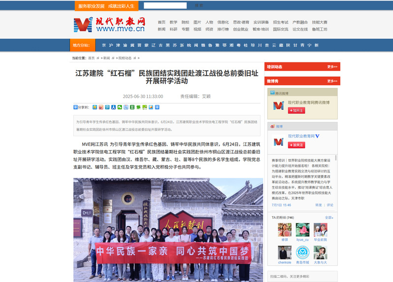 MVE网江苏讯 为引导青年学生传承红色基因、铸牢中华民族共同体意识,6月24日,华体会体育信电工程学院“红石榴”民族团结暑期社会实践团赴徐州市铜山区渡江战役总前委旧址开展研学活动。实践团由汉、维吾尔、藏、蒙古、壮、苗等8个民族的多名学生组成,学院党总支副书记、辅导员、班主任及学生党员和入党积极分子也共同参与。