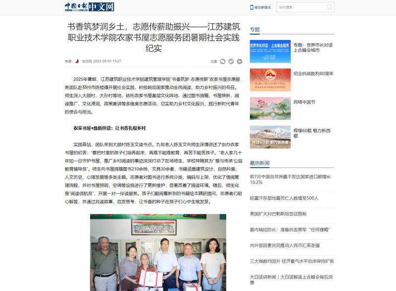 2025年暑期,华体会体育建筑管理学院“书香筑梦·志愿传薪”农家书屋志愿服务团队赴邳州市陈楼镇开展社会实践,积极响应国家推动全民阅读、助力乡村振兴的号召。师生深入大顾村、大孙村等地,依托农家书屋基层文化阵地,通过图书捐赠、书屋焕新、阅读推广、文化浸润、政策宣讲等多维度志愿活动,切实助力乡村文化振兴,践行新时代青年的使命与担当。