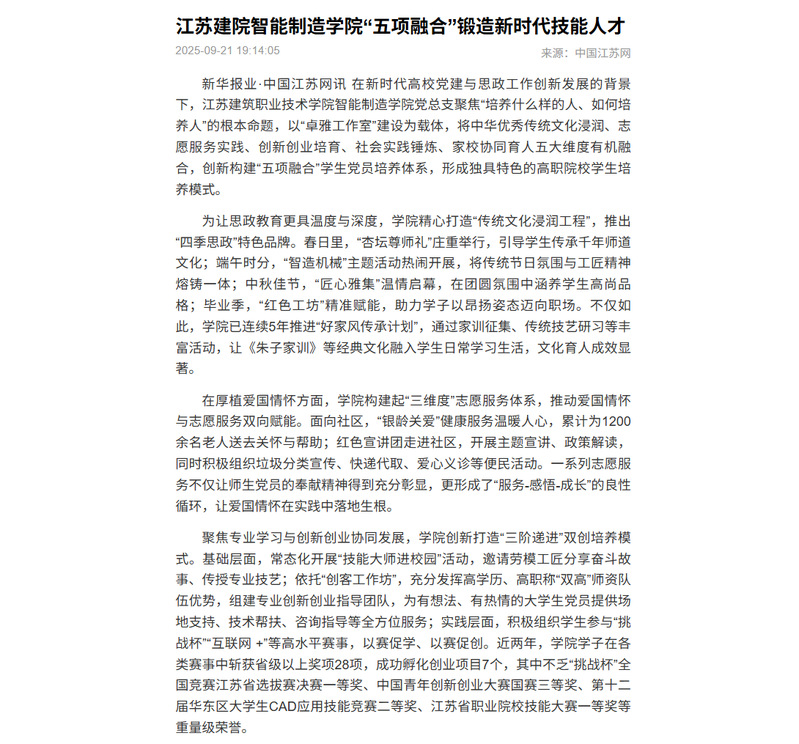 “五项融合”育人体系实施以来,学院人才培养质量显著提升。学生党员荣获省级以上奖项覆盖率大幅提高,国家奖学金获得者中党员占比近八成,毕业生党员赴重大工程领域就业率实现翻番,3名学子获评徐州市技能能手。相关成果先后被国家、省、市媒体专题报道,学院还荣获江苏省党建创新党日活动二等奖。