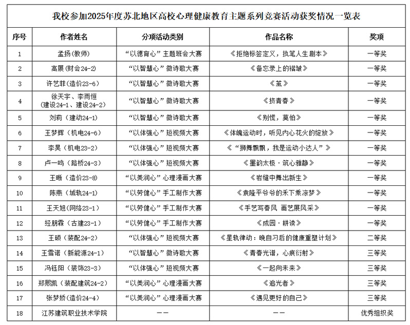 9月19日,江苏省苏北地区大学生心理健康教育研究中心公布2025年苏北高校大学生心理健康教育主题系列竞赛获奖名单,我校共获17个奖项,其中一等奖12项、二等奖1项、三等奖4项,同时学校蝉联优秀组织奖。