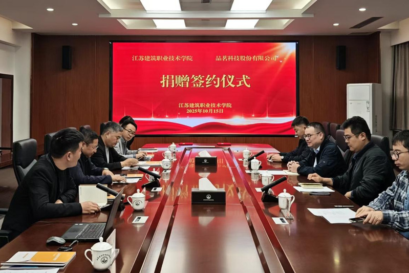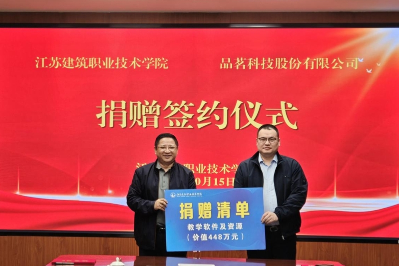 10月15日,品茗科技股份有限公司向我校捐赠价值448万元的教学软件及资源使用权,捐赠签约仪式在第一实训楼103会议室举行。党委委员、副校长蒋兆峰,品茗科技数字教育事业部副总经理沈洪波、数字政务事业部苏皖分支经理梁浩出席活动,校科技开发与对外合作处、建筑管理学院相关负责人及教师代表参加活动。